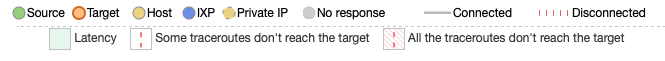 Figures 5, 6, 7, 8, and 9 display for each probe the evolution of the RTT from the source IP to their different destination IPs (y-axis) over the period of the measurements campaign (x-axis). Figure 10, 11, and 12 present not only the RTTs to the destination IPs, but also the inferred AS paths at key moments of the said campaign. We analyze and compare those figures in the next paragraphs, highlighting the insights they provide.
