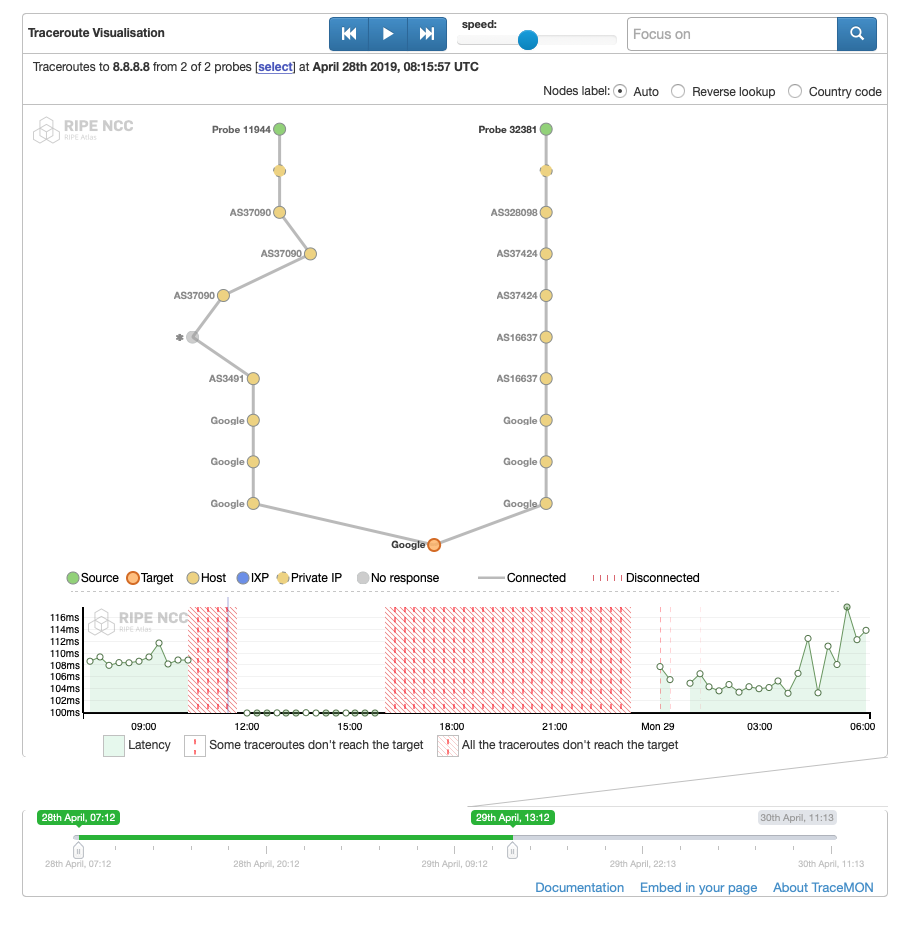 **Figure 9:**RIPE Atlas measurement, Recurring IPv4 traceroute measurement from all probes online in Benin to www.google.com, https://atlas.ripe.net/measurements/21083844/, April 28, 2019