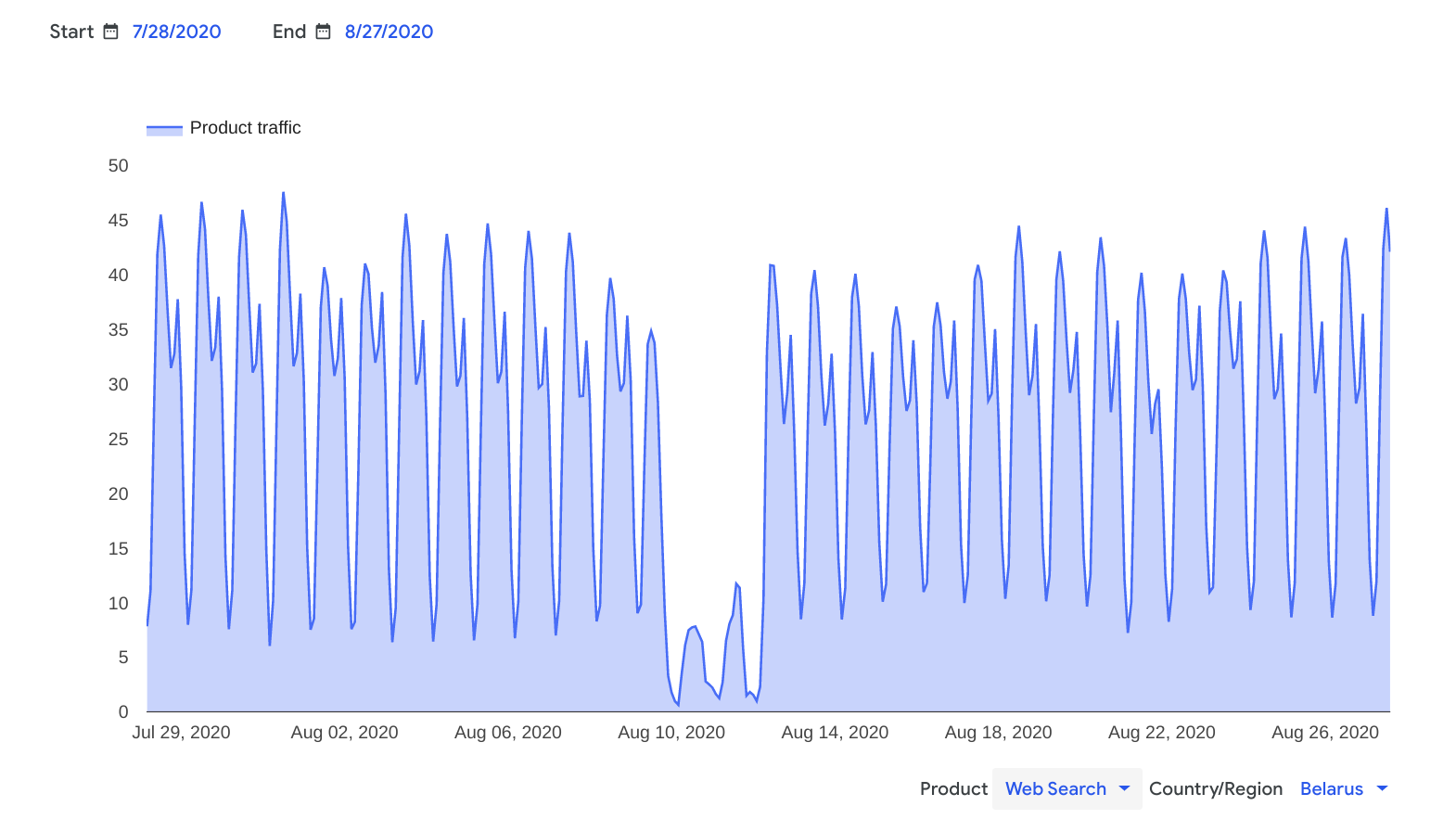 Similarly to IODA data, Google traffic data shows that Belarus experienced major internet disruptions in the nights of 9th, 10th, and 11th August 2020, with internet access mildly being restored during the day on 10th and 11th August 2020.
