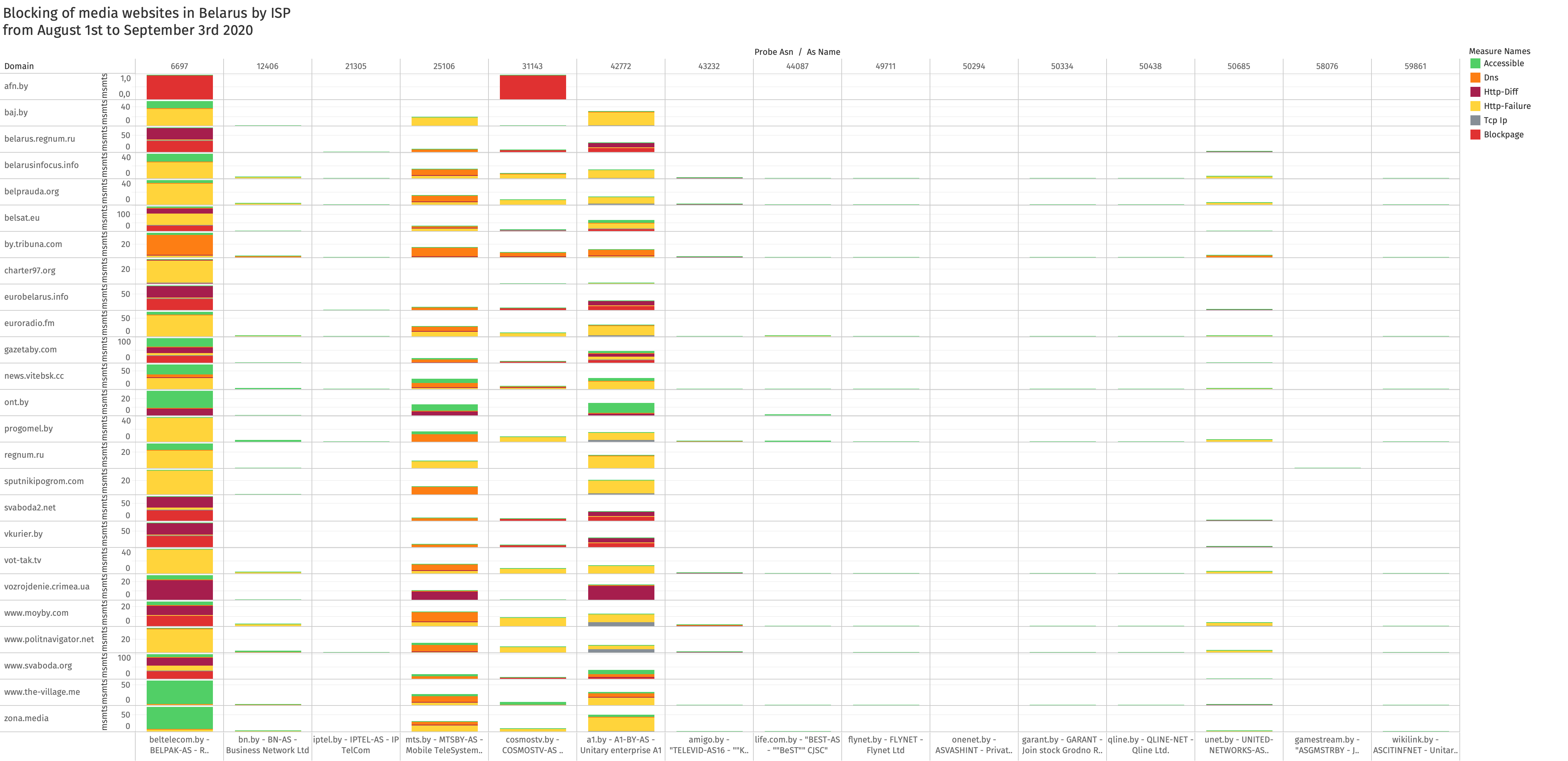 Image: Blocking of media websites across ISPs in Belarus, OONI measurements collected from Belarus between 1st August 2020 to 3rd September 2020