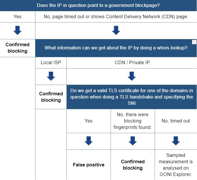 - Identifying the type of network interference based on a set of heuristics for DNS tampering, TCP/IP blocking, and HTTP blocking.
