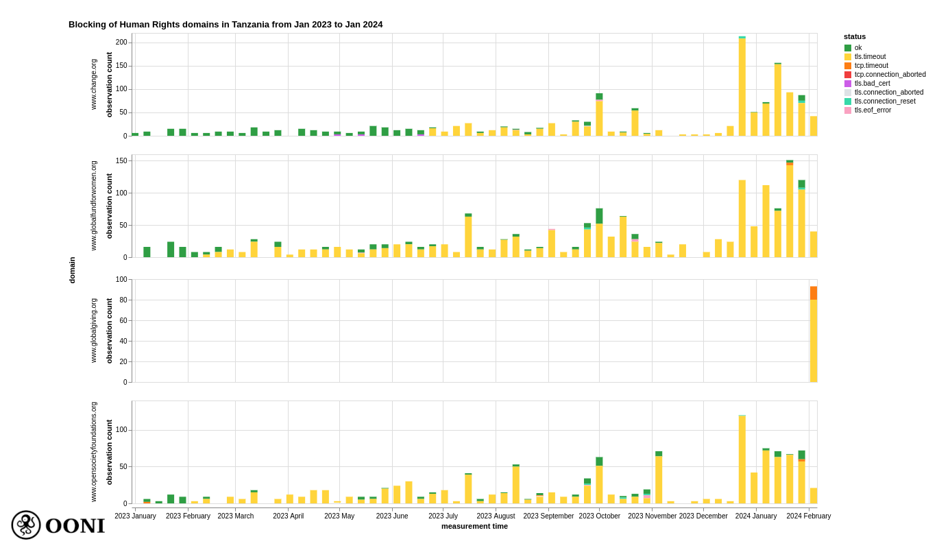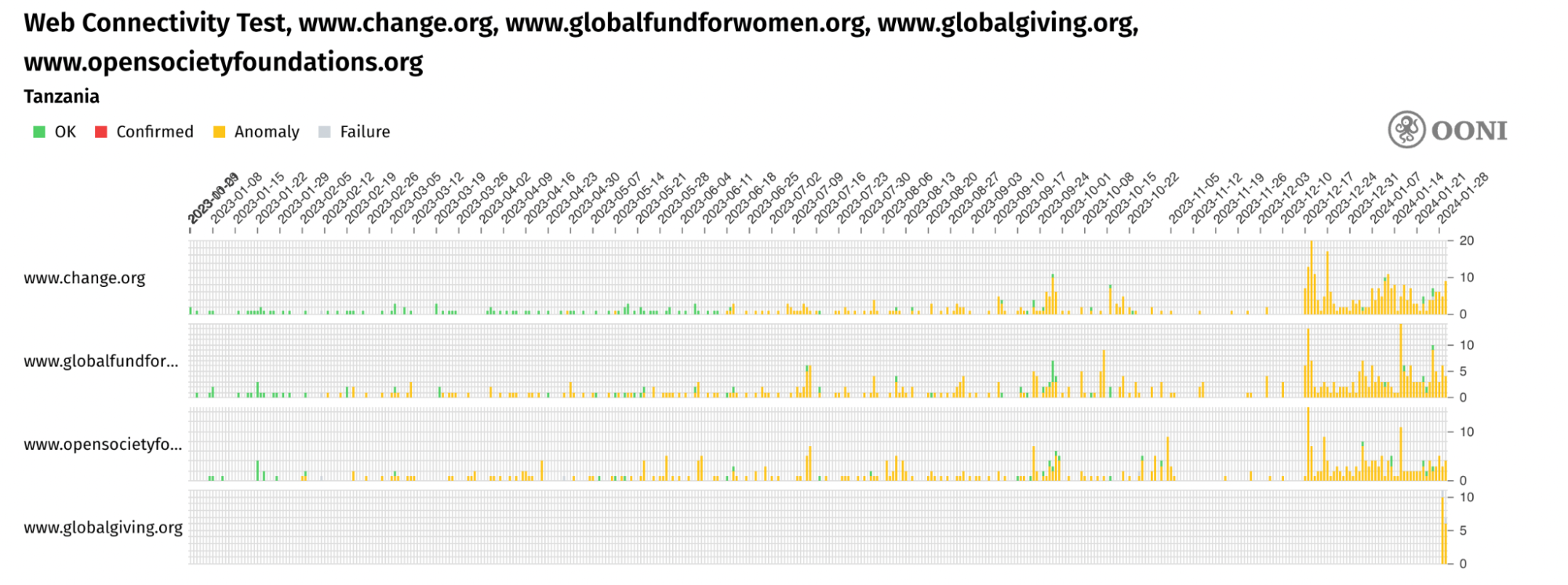 Chart: OONI Probe testing of www.change.org, www.globalfundforwomen.org, www.globalgiving.org, and www.opensocietyfoundations.org in Tanzania between 1st January 2023 to 31st January 2024 (source: OONI data).