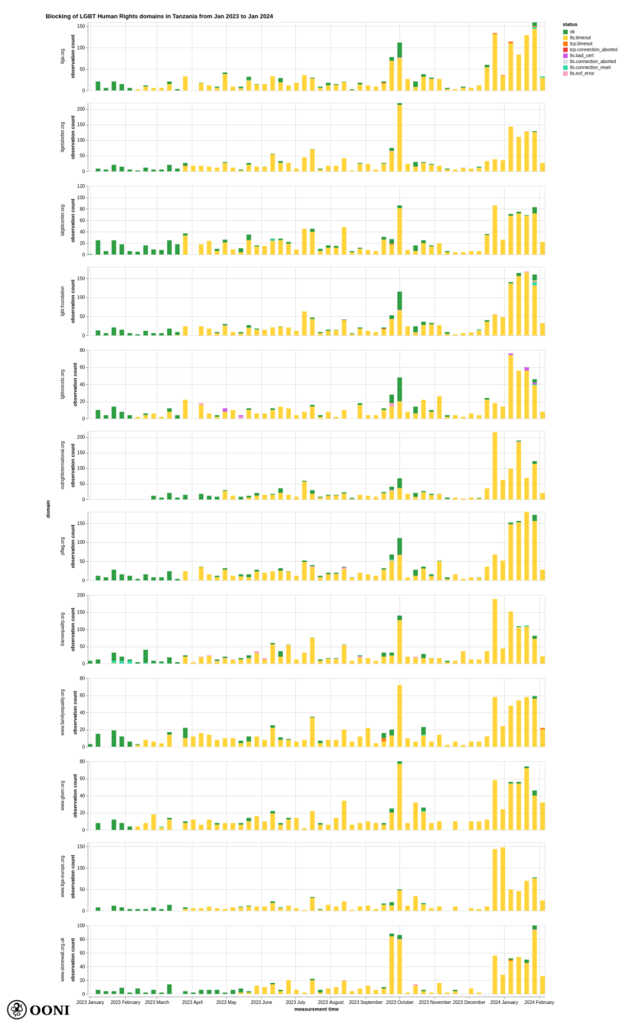 Our analysis of OONI data collected from Tanzania over the last year (between 1st January 2023 to 31st January 2024) reveals the extensive blocking of LGBTIQ sites, which correlates with the escalating discrimination and crackdown on LGBTIQ communities in Tanzania in recent years. Many other blocks identified as part of this study appear to be targeted in nature, as they involve very specific websites, while other (more popular) sites from the same category (e.g. social media, human rights) were found accessible.
