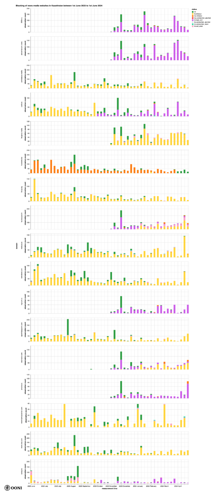 Все вышеперечисленные домены новостных СМИ в течение всего периода тестирования демонстрировали большое количество аномалий (по сравнению с общим объемом измерений), что свидетельствует о наличии блокировки. Это иллюстрируется следующими графиками, которые представляют собой совокупность измерений OONI, собранных в ходе тестирования вышеуказанных 17 доменов в нескольких сетях в Казахстане в период с 1 июня 2023 года по 1 июня 2024 года.